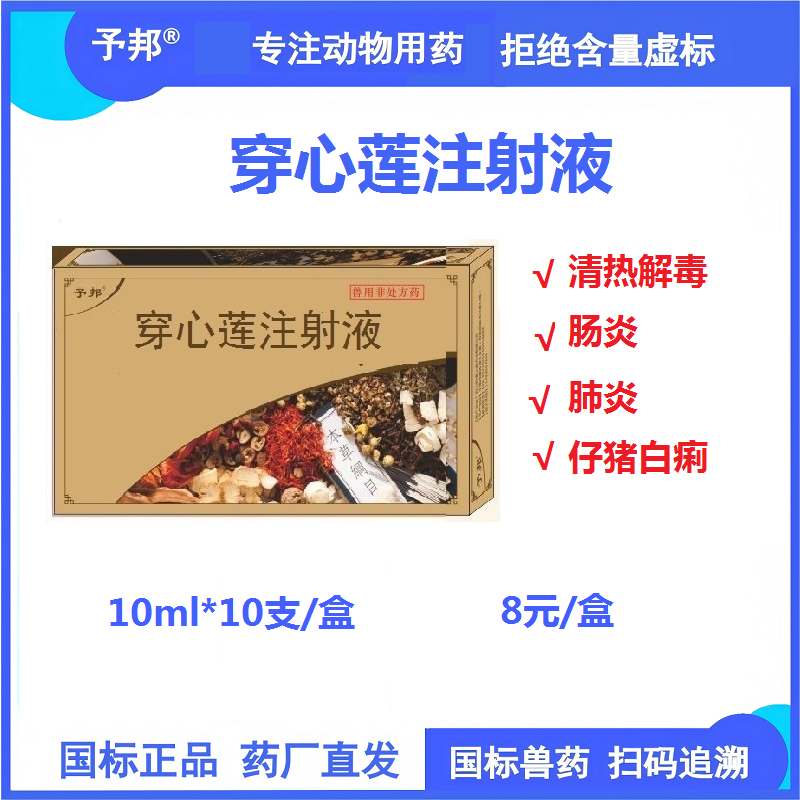 商品名称:【予邦】穿心莲注射液10ml兽药 国标可追溯 清热解毒肠炎肺炎仔猪黄白痢猪牛羊马犬可用