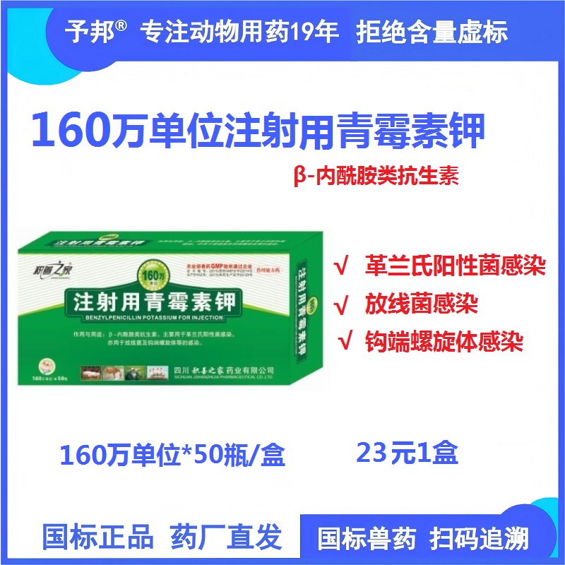 [兽用处方药]1g*50瓶/盒 【予邦】160万单位注射用青霉素钾50支兽用兽药 国标可追溯 抗生素抗菌细菌感染猪牛羊马犬可用